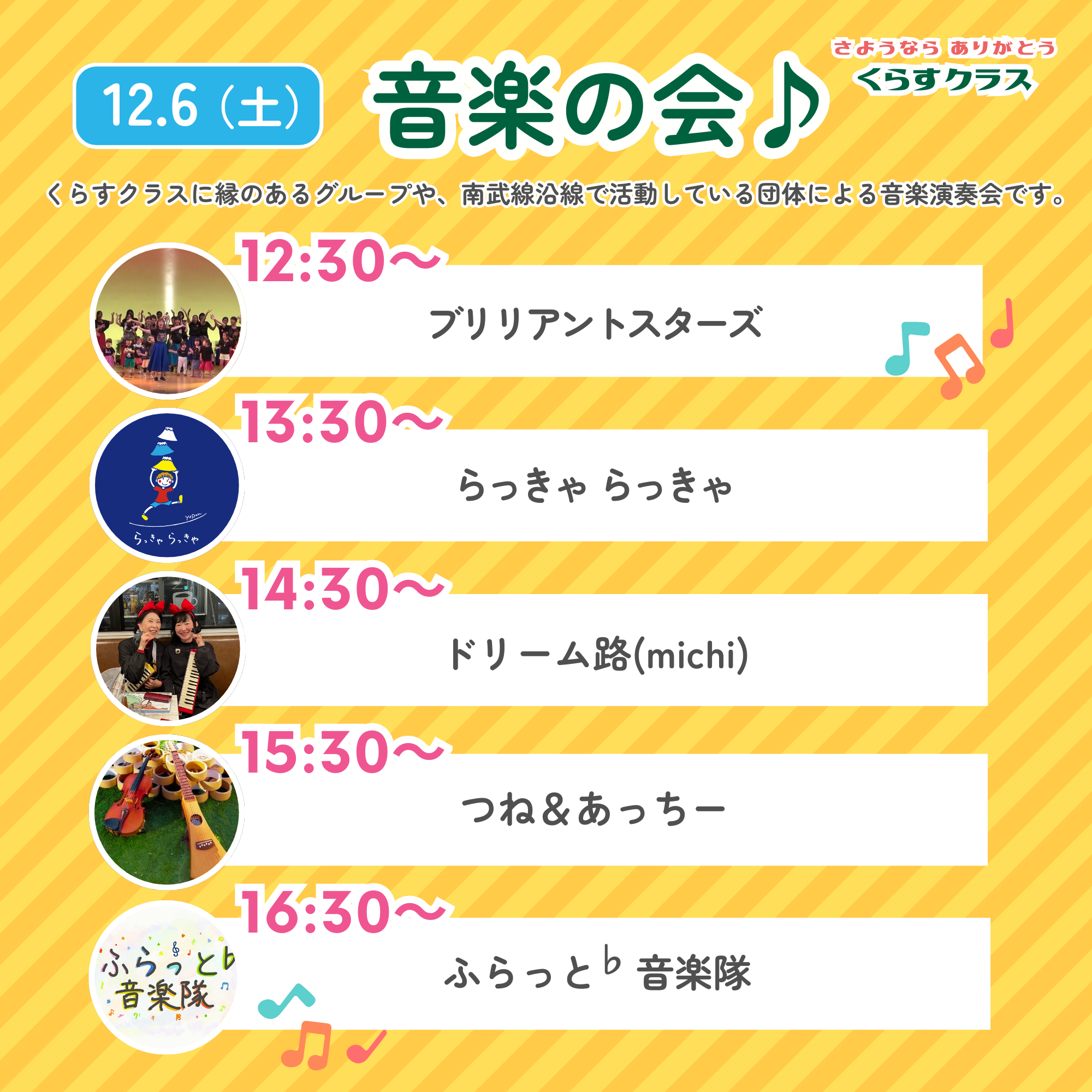 ふらっと♭音楽隊など、くらすクラスに縁のあるグループや南武線沿線で活動している団体による音楽演奏会です。