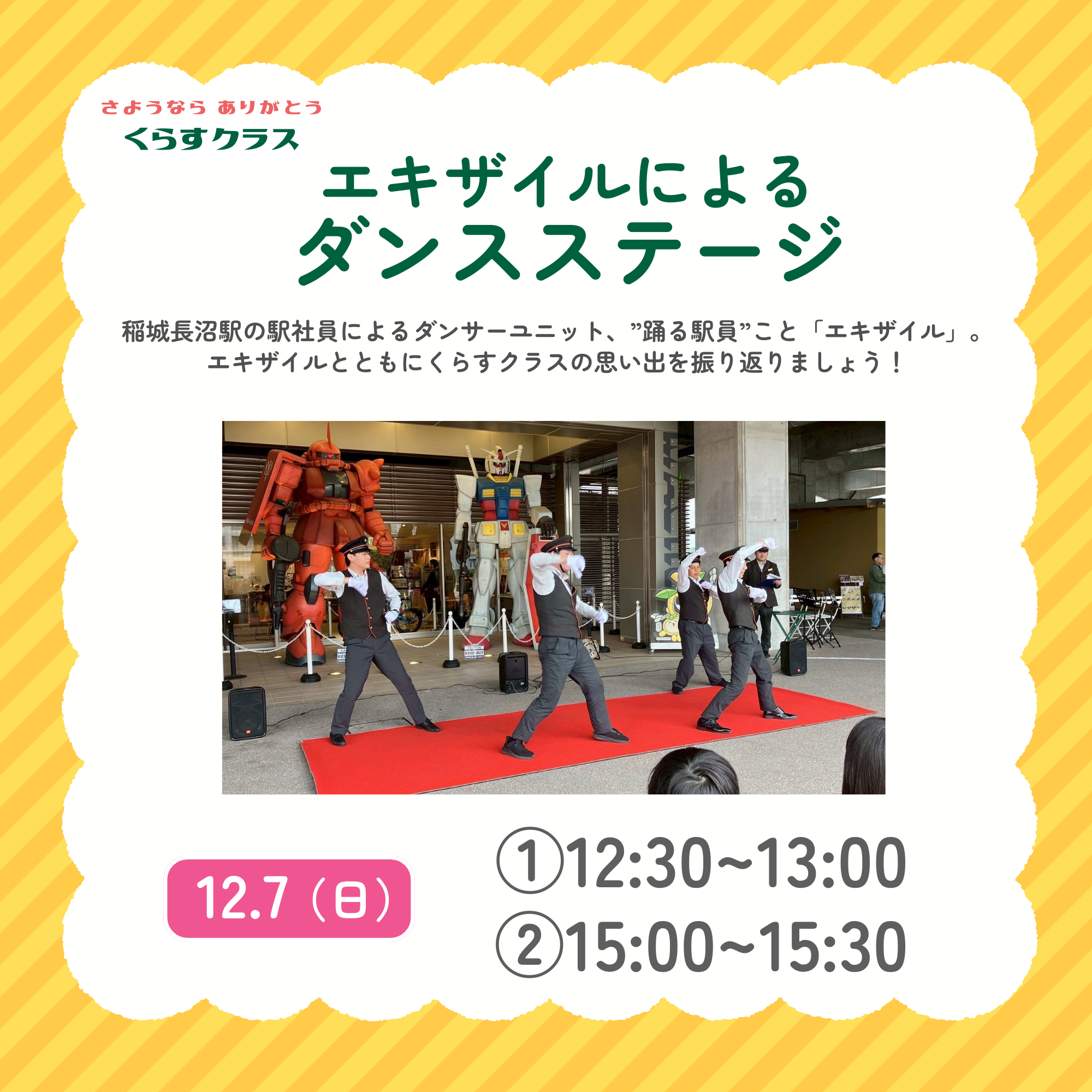稲城長沼駅の駅社員によるダンサーユニット、”踊る駅員”こと「エキザイル」。エキザイルは東小金井駅で誕生した駅社員によるダンサーユニットで、現在は稲城長沼駅を中心に活動中です。近隣の大学の学園祭にくらすクラスのブース出展と合わせてエキザイルも出演するなど、くらすクラスと共に新たな活動のステージを広げてきました。